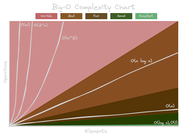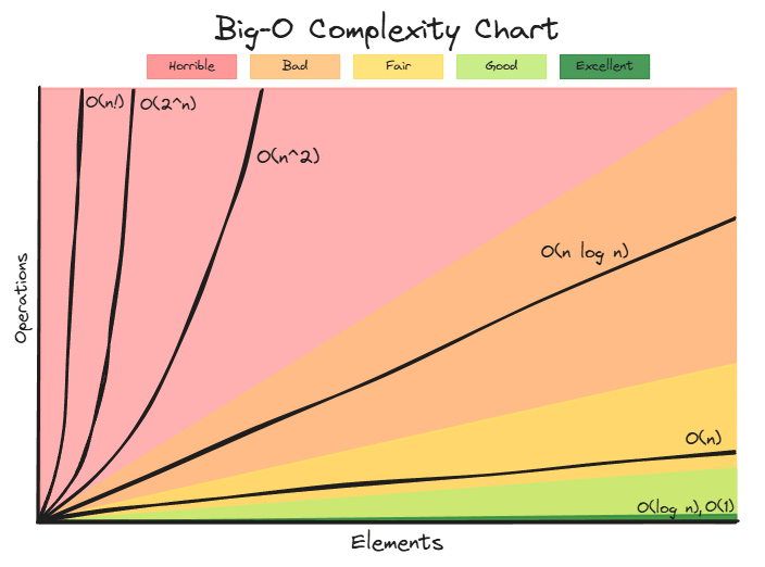 The graph makes the differences vivid. O(1) and O(log n) are practically flat compared to the explosive growth of O(n2) and beyond. This is exactly why choosing the right algorithm matters so much.