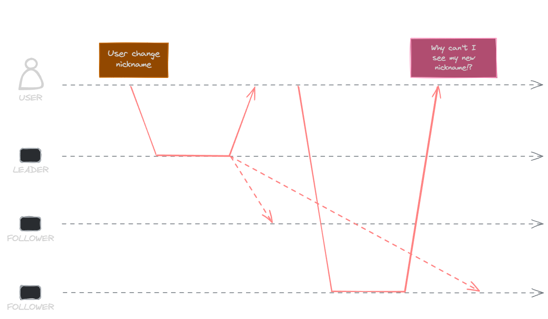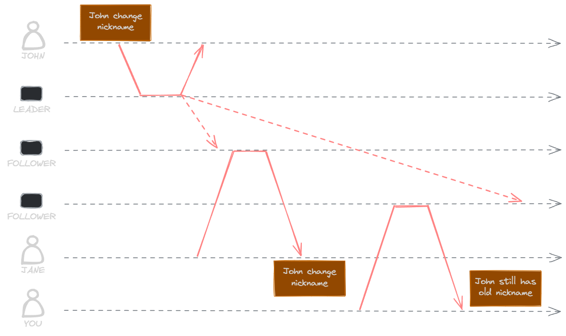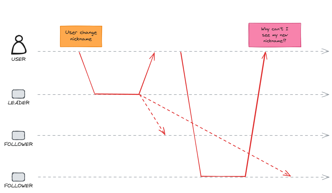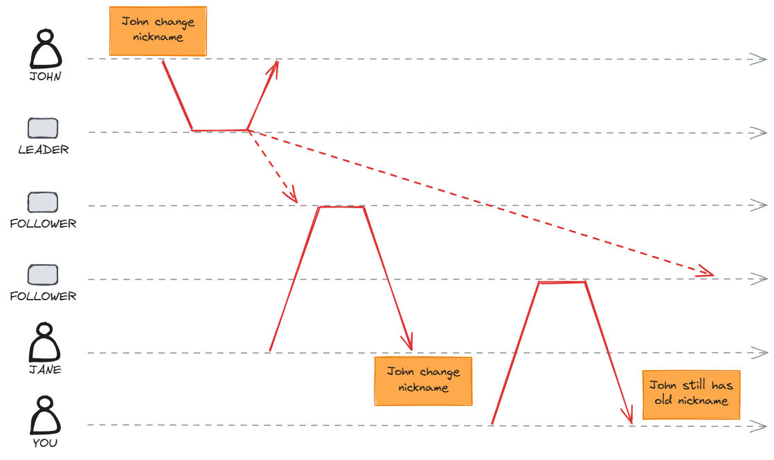 In this scenario, when the customer requests data from the leader, they will receive updated data. However, if the request goes to the follower, it will return stale data. In our example, this would be the previous nickname, as the follower never received the information to update the data.