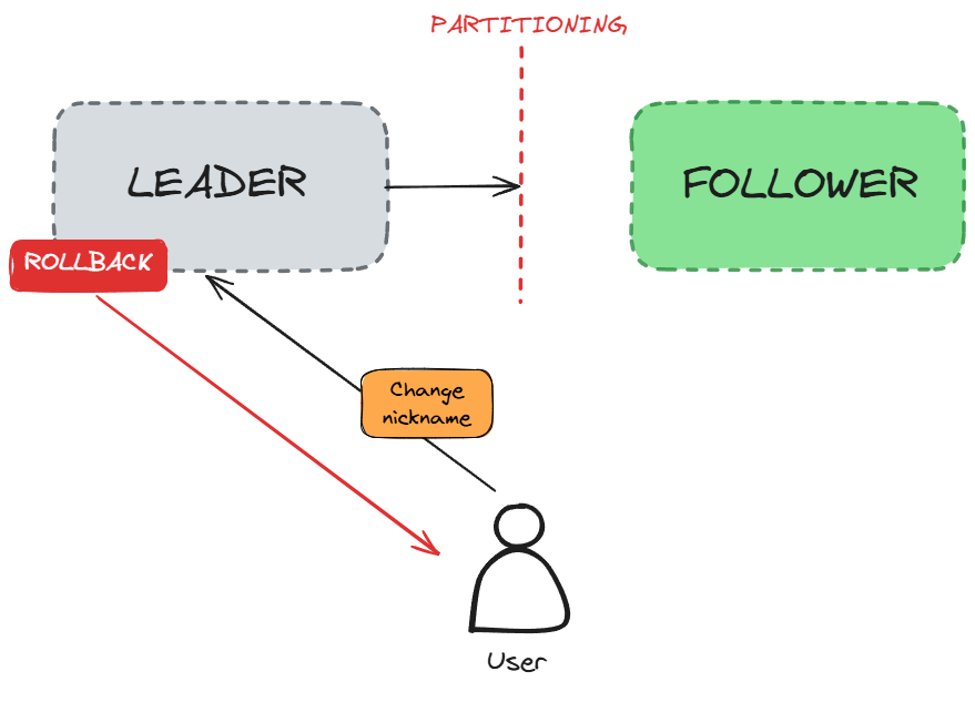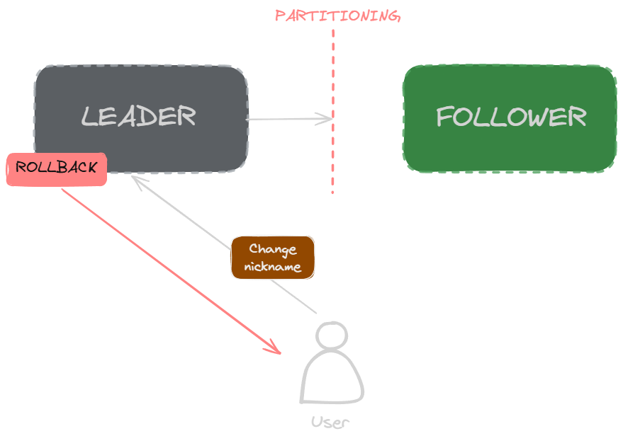 From the perspective of the CAP theorem, this model guarantees consistency, as the transaction was not committed. When requesting data from either the leader or follower nodes, the data will be consistent and have the same nickname. The model also guarantees partitioning tolerance, as the system remains operational even if the connection between the leader and follower nodes is lost. However, the model does not guarantee availability, as even though the node is operational, it returns an error. Therefore, from a CAP perspective, this model guarantees CP (consistency and partition tolerance).