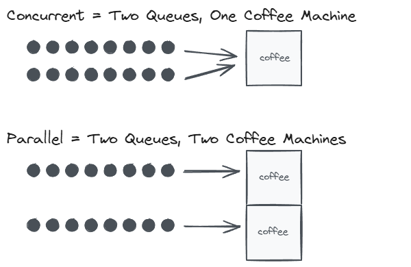 Concurrency and parallelism are often confused, but they describe fundamentally different things. Parallelism is about doing multiple things at the same time. Concurrency is about structuring a program to deal with multiple things at once, even if only one actually runs at any given moment.