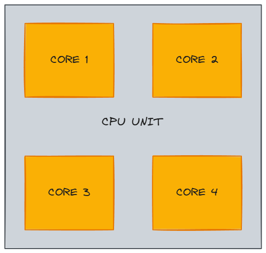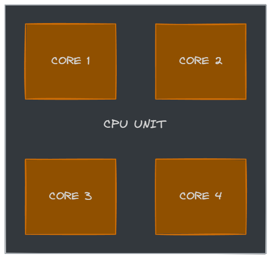 Parallelism means that multiple operations genuinely run at the same time on separate CPU cores. A processor with four cores can execute four threads truly simultaneously. Each core runs at a certain clock speed (e.g., 2.6 GHz means 2.6 billion clock cycles per second), which determines how quickly it processes instructions.