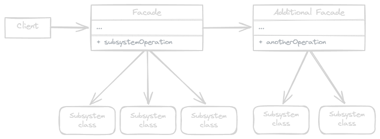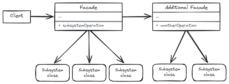 public, I guarantee that external code cannot bypass the intended API. - I need to decouple layers. When a higher-level module depends on a lower-level subsystem, a facade serves as the boundary. If the subsystem internals change, only the facade needs updating, and callers remain untouched.